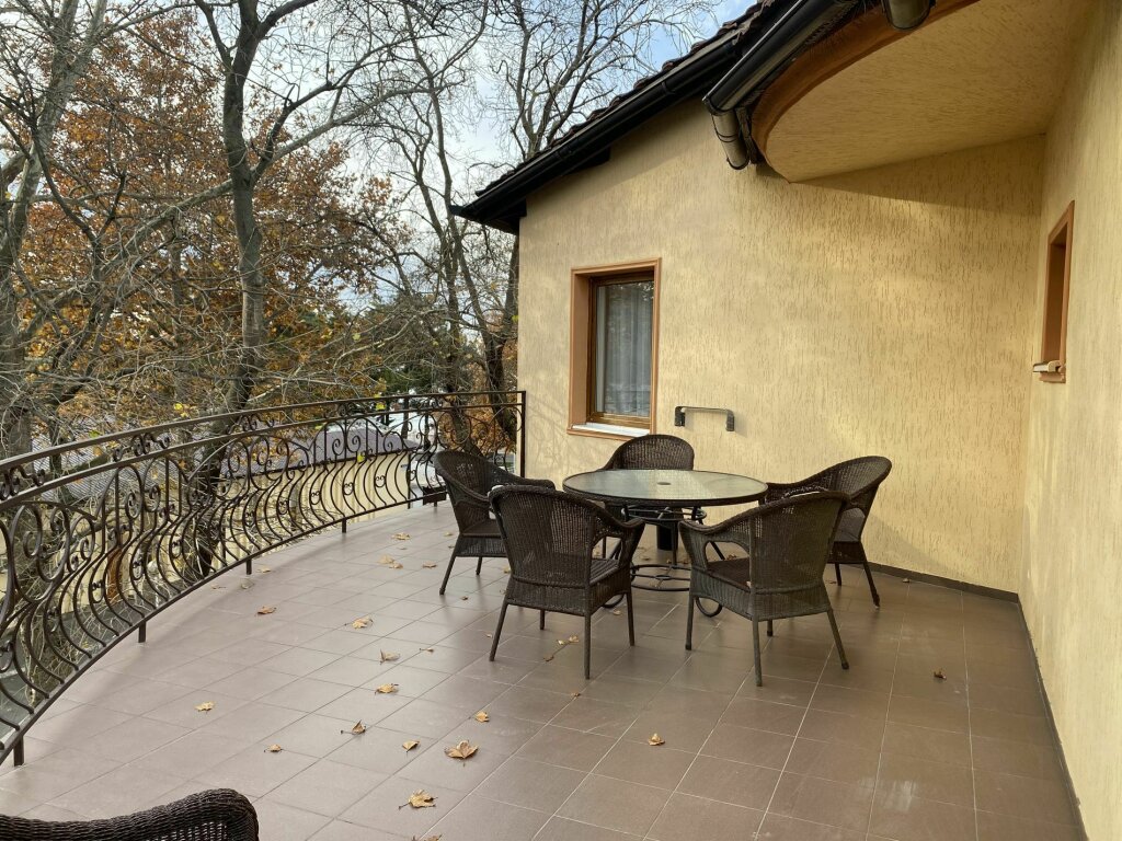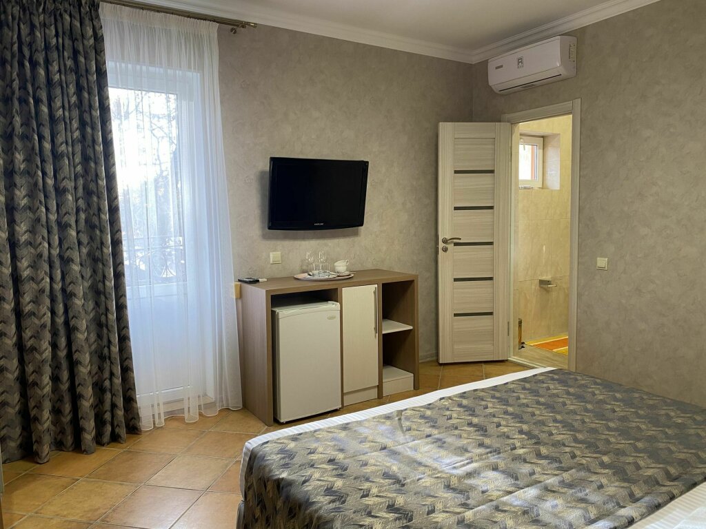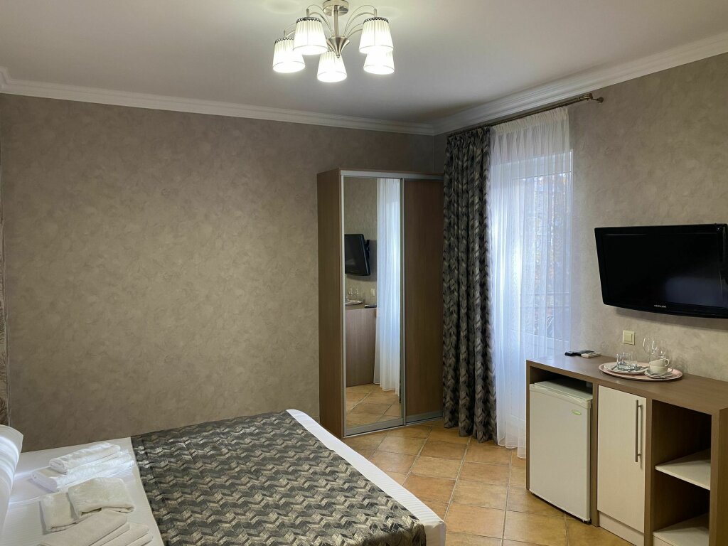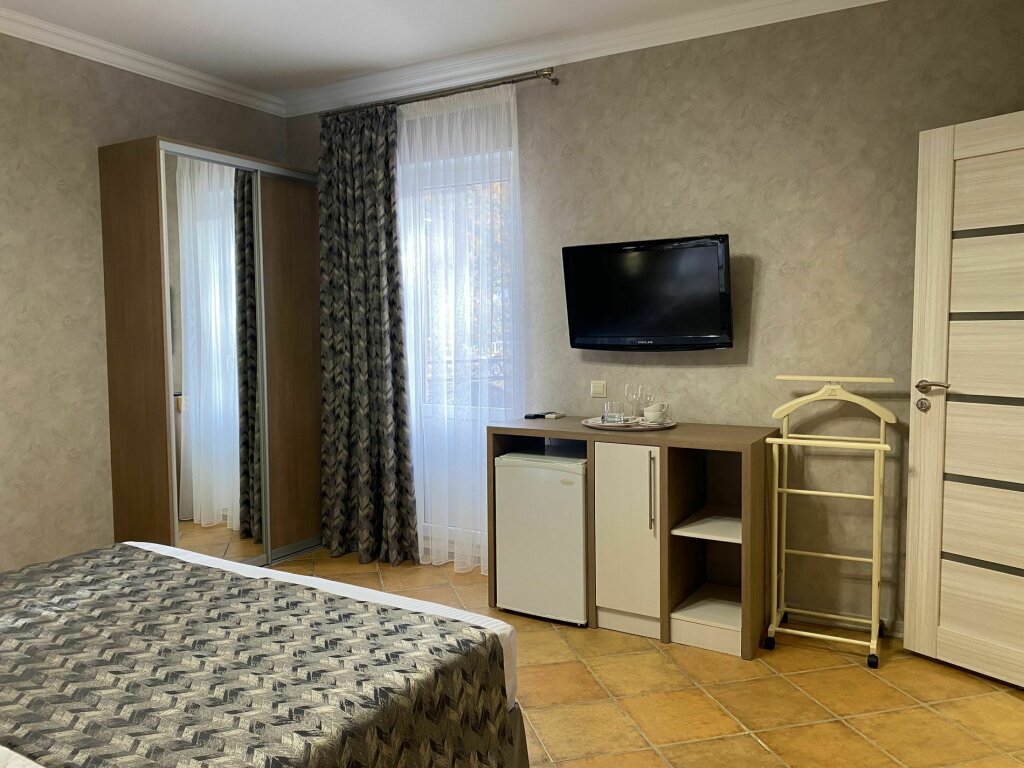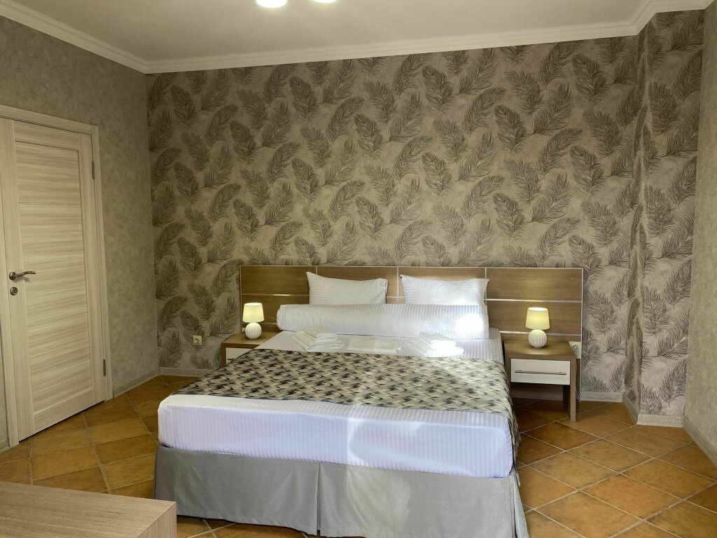 Двухместный номер с терассой, расположен на третьем этаже. Комплектация: двуспальная кровать мебельный гарнитур вместительный шкаф, зеркало, прикроватные тумбочки постельное белье и полотенца тапочки собственная ванная комната с душем туалетные принадлежности фен электрочайник набор посуды (тарелки, вилки, ножи, чайные ложки, бокалы, чайная пара, стаканы под воду, штопор) холодильник телевизор сплит-система Wi-fi
