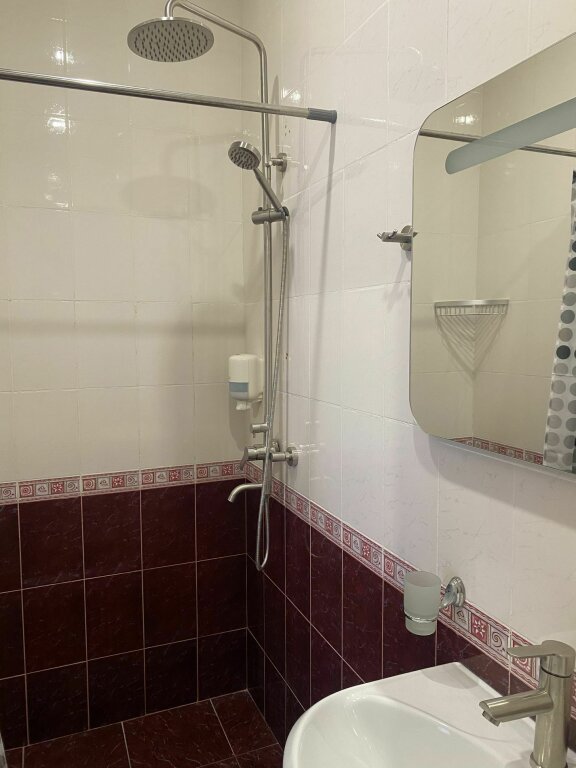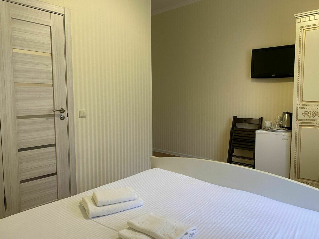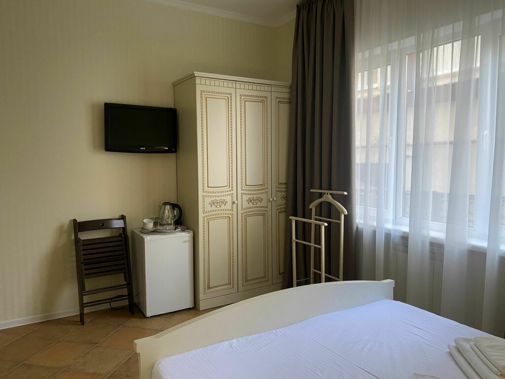 Двухместный номер, расположен на первом этаже. Комплектация: двуспальная кровать мебельный гарнитур вместительный шкаф, зеркало, прикроватные тумбочки постельное белье и полотенца тапочки собственная ванная комната с душем туалетные принадлежности фен электрочайник набор посуды (тарелки, вилки, ножи, чайные ложки, бокалы, чайная пара, стаканы под воду, штопор) холодильник телевизор сплит-система Wi-fi